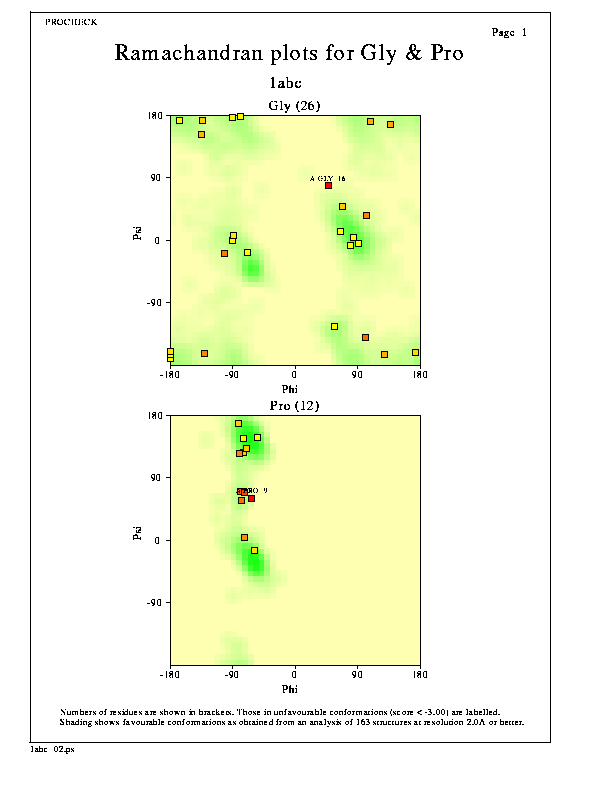 The favourable- and unfavourable regions of both these residue types differ markedly from those of the other residues. The darker the shaded area on the plots, the more favourable the region. The data on which the shading is based has come from a data set of 163 non-homologous, high-resolution protein chains chosen from structures solved by X-ray crystallography to a resolution of 2.0Å or better and an R-factor no greater than 20%.