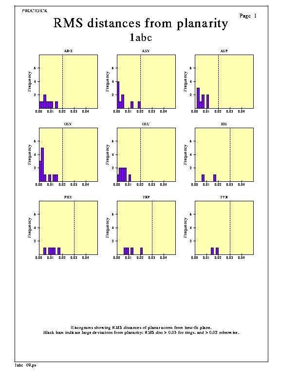 These histograms show the RMS distances from planarity for the different planar groups in the structure. The dashed lines indicate different ideal values for aromatic rings (Phe, Tyr, Trp, His) and for planar end-groups (Arg, Asn, Asp, Gln, Glu). The default values are 0.03Å and 0.02Å, respectively, but these values can be altered by editing the procheck.prm file.
