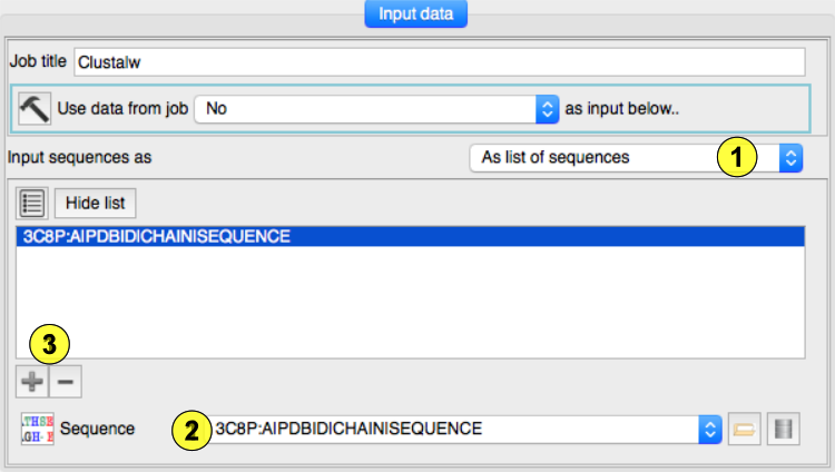 To enter multiple sequences files select the first in the Sequence line (2) and then click the '+' button (3) to create the next element in the sequence list.