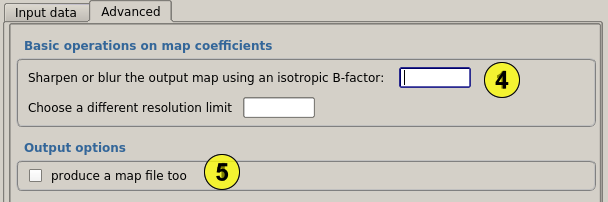 You can perform basic filtering on the produced map coefficients. For instance, a positive isotropic B-factor can be used for blurring the electron density, or a negative one for sharpening it (4). A map file can also be produced by selecting option (5). This will trigger a cfft run and output the map file in CCP4 format.