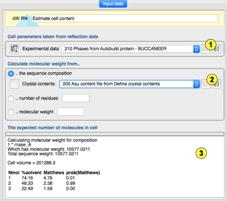 The task interface requires an MTZ experimental data file 1 from which it can read the cell parameters and calculate the cell volume. The expected cell contents can be entered as a crystal content object which contains a list of seqeunces2, or the number of amino acid residues in the structure or the structure molecular weight.