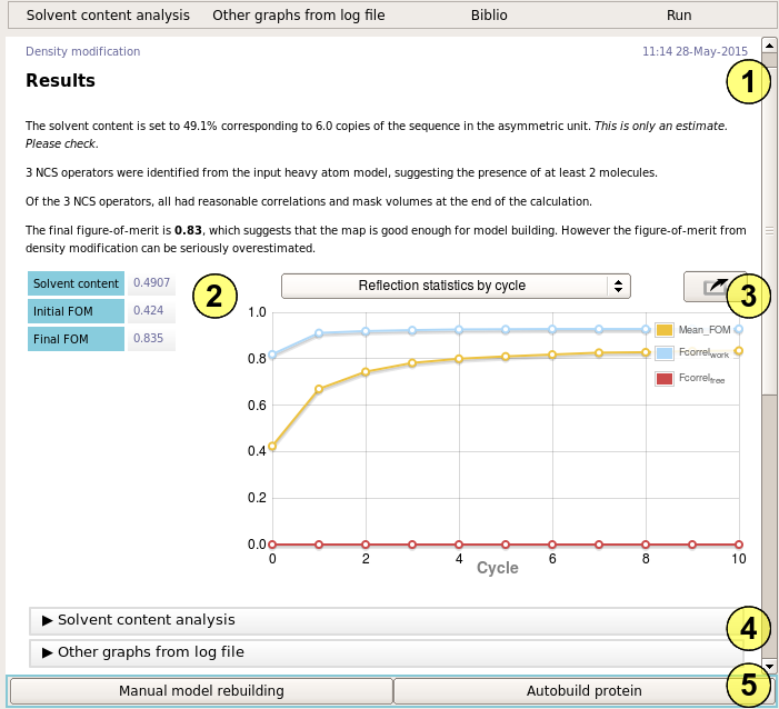 The results table (2) summarizes the density modification statistics in tabular form. The reflection statistics by cycle graph (3) tells you how the phases are improving over the course of the calculation. Detailed analysis of the likely solvent content and further statistics can be seen in the remaining folders (4).