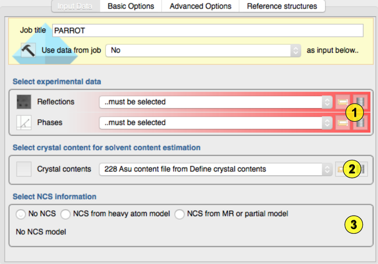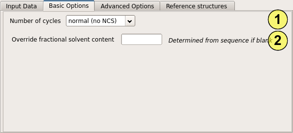 The crystal content must be selected (2) - this should have been entered in the Define crystal content task but can be entred on the fly by clicking the file browser button and selecting a sequence file. The specified sequence content is used to estimate the proportion of the asymmetric unit occupied by solvent (the solvent content), and the number of copies of the protein present. If you have a better estimate of the solvent content, you can also provide this value under "Basic options".