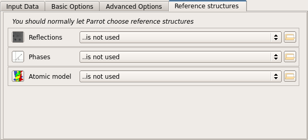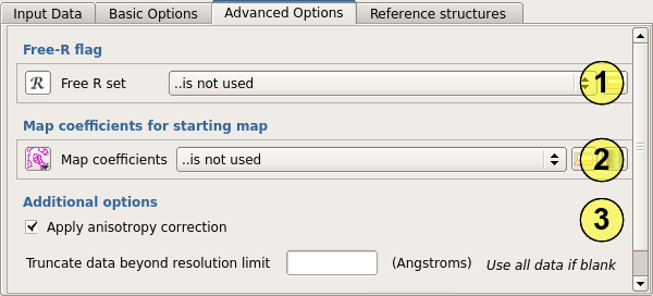 Map coefficients for a starting map may also be provided (2). This option is useful when a good starting map is available but the corresponding phases are know to be biased - for example after a combined MR-SAD calculation. In this case, the electron density from the refined model would be entered as map coefficients, and the SAD phases only entered on the input page.