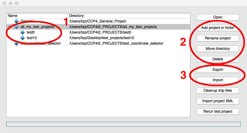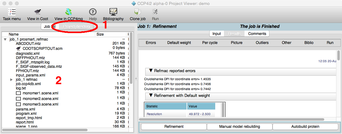 1The Project directory tab opens a view of all the directories and files in the project directory. You should not need to use this often but if you need to see what is happening then note that the 'top' directory for each job often contains sub-directories - one for each major program run.