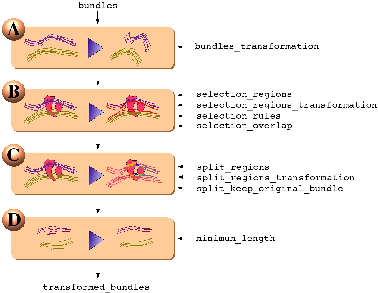 bundlesparameter) and producing one modified bundle file (intransformed_bundlesparameter). Each filter is optional. If the parameters of a filters are empty, the corresponding filtering step is skipped. The filters are organized and linked together with the following structure :A - Bundles geometrical transformation